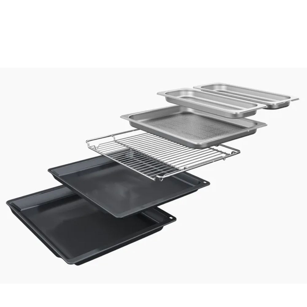 Không gian bên trong lò nướng được thiết kế 5 tầng. Sản phẩm có đi kèm 6 phụ kiện khay nướng gồm khay nướng tráng men nông lòng (enamel baking tray), khay hấp có lỗ nhỏ sở hữu kích thước XL & M, khay nướng tráng men sâu lòng (universal pan), khay hấp không lỗ có kích thước M và giá nướng (grid).