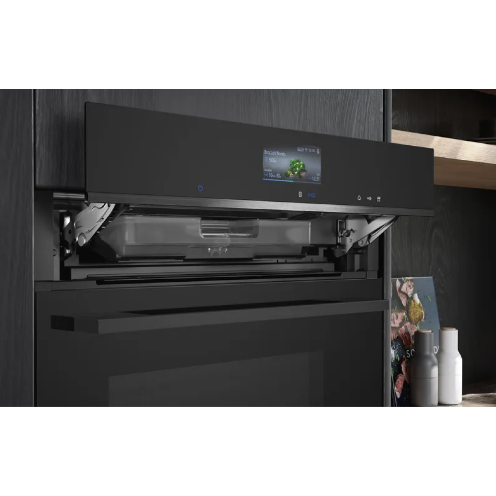 Lò nướng kèm hấp Siemens HS736G3B1 iQ700 âm tủ tối ưu không gian lắp đặt, giúp cho nhà bếp thêm phần hiện đại nhờ kiểu dáng sang trọng. Màn hình điều khiển cảm ứng hiện đại, dễ thao tác. Lò nướng còn tích hợp nhiều chế độ nướng, hấp tiện lợi và sở hữu dung tích lớn. Ngoài ra, Siemens HS736G3B1 cũng gợi ý được nhiều chế độ nấu phù hợp với từng món ăn cookControl Pro, đồng thời cho phép người dùng tùy chỉnh tăng cường hơi nước Steam Boost, điều khiển từ xa qua ứng dụng, làm nóng lò nhanh Fast Preheat và nhiều tiện ích hiện đại khác. Cảm biến nhiệt kế roastingSensor Plus còn hỗ trợ lò nướng cho ra được món ăn có độ chín hoàn hảo như các đầu bếp chuyên nghiệp.